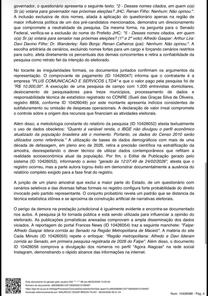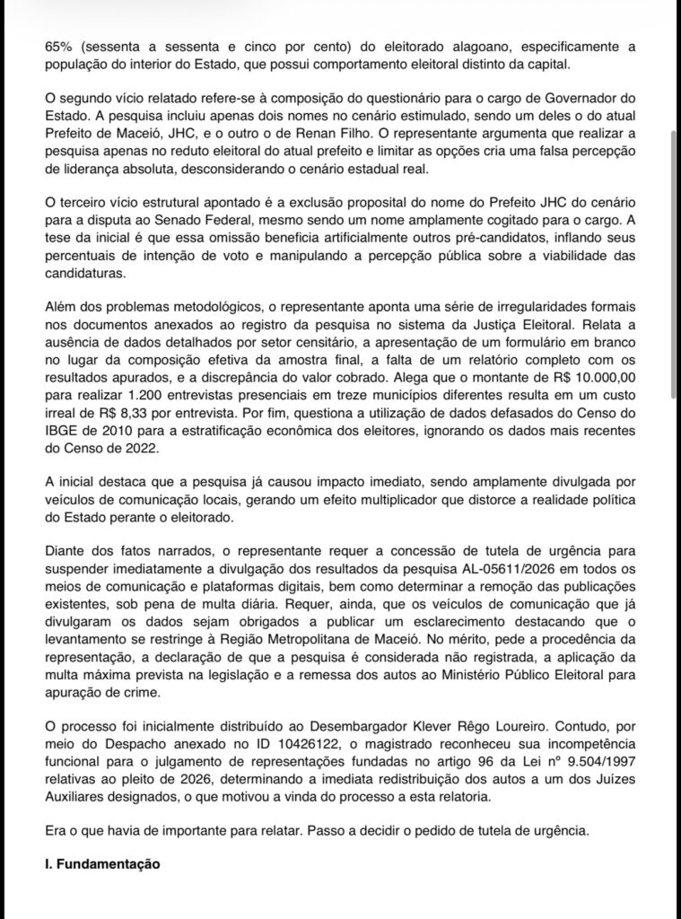 A decisão também aponta problemas na elaboração do questionário utilizado pela pesquisa. No cenário estimulado para governador, foram apresentados apenas dois nomes — o prefeito de Maceió, JHC, e o ex-governador Renan Filho. Para o relator, essa combinação, associada à realização da pesquisa justamente na região de maior influência política de um dos citados, cria uma percepção artificial de liderança eleitoral.