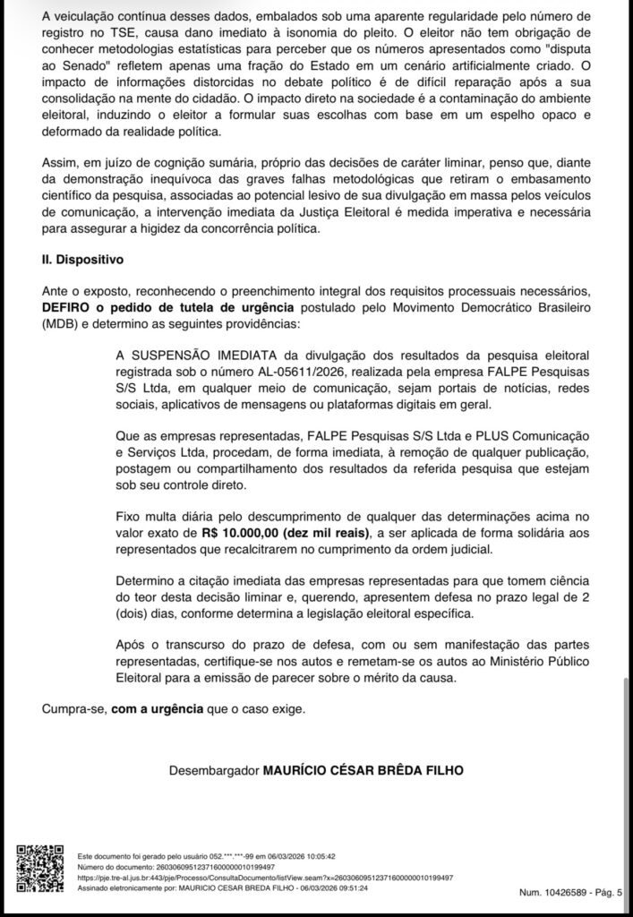 Uma decisão liminar do Tribunal Regional Eleitoral de Alagoas (TRE-AL) determinou, nesta sexta-feira (6), a suspensão imediata da divulgação da pesquisa registrada sob o número AL-05611/2026, realizada pela empresa Falpe Pesquisas. O relator do caso, desembargador Maurício César Breda Filho, apontou indícios de graves falhas metodológicas e formais no levantamento, que havia sido apresentado ao público como retrato da disputa eleitoral no estado. A decisão foi tomada após representação do diretório estadual do MDB.