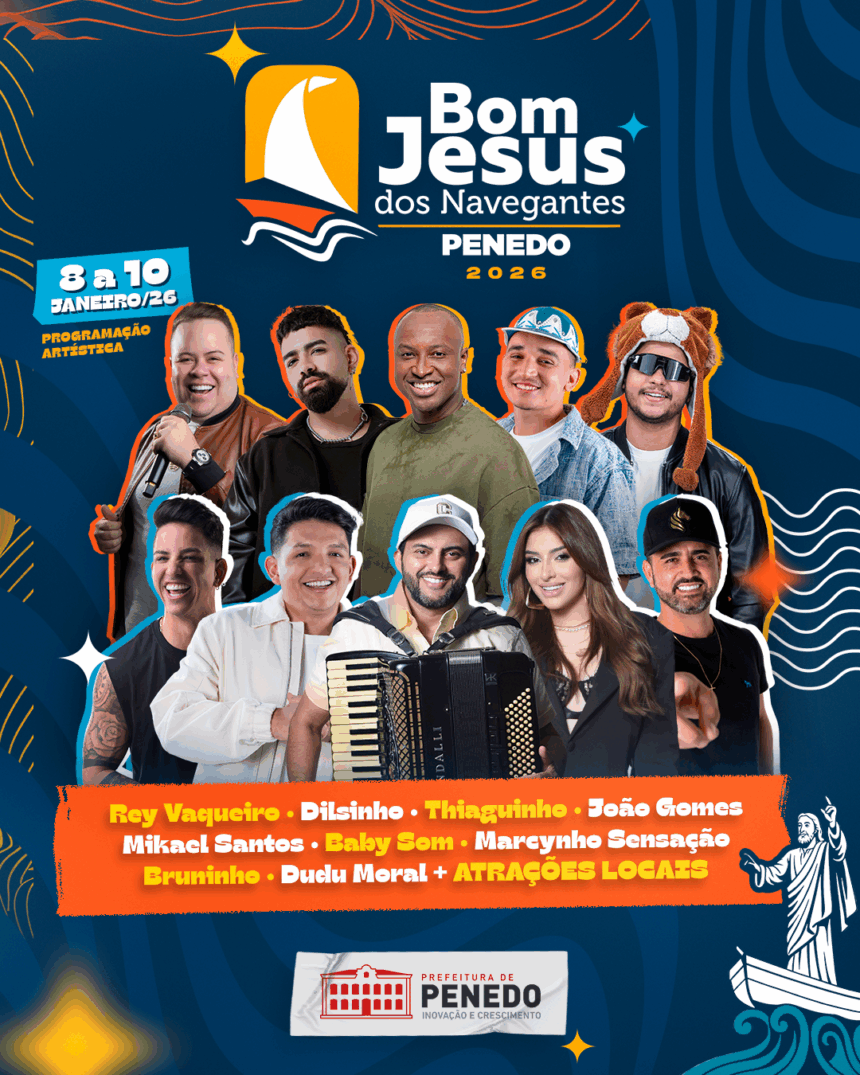 A Prefeitura de Penedo confirmou a programação artística do tradicional Bom Jesus dos Navegantes 2026, um dos eventos mais aguardados do calendário cultural do Nordeste. A festa artística acontecerá de oito a dez de janeiro na Arena Sinimbu, localizada na Orla de Penedo, reunindo grandes nomes da música nacional e valorizando artistas locais. O domingo, dia onze, será reservado exclusivamente para a programação religiosa, que será anunciada em breve.